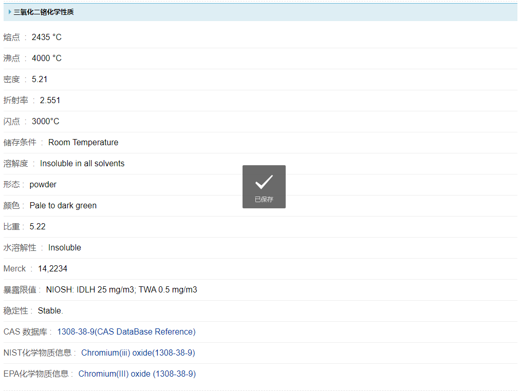 三氧化二鉻亦稱氧化鉻、氧化鉻綠、鉻綠,為暗綠色結(jié)晶粉末,有金屬光澤,屬于六方晶系或三方晶系,和α-氧化鋁是同一種晶型?;瘜W(xué)式Cr2O3,分子量151.99,相對(duì)密度5.21 (21℃),莫氏硬度為9,比石英、鋼還硬,熔點(diǎn)2266±25℃,沸點(diǎn)3000℃以上,化學(xué)性質(zhì)極其穩(wěn)定。有磁性,不溶于水和乙醇中,既耐酸又耐堿。即使在紅熱狀態(tài)下通入氫氣也幾乎不被還原。另外,和硫黃與硫化氫一起加熱也很難反應(yīng)。經(jīng)高溫灼燒過的氧化鉻綠對(duì)酸堿均呈惰性,但可與酸性熔劑共熔, 轉(zhuǎn)變成可溶性鉻 (Ⅲ)鹽。和溴酸堿金屬鹽水溶液一起加熱則反應(yīng)而溶解,能溶于熱的溴酸鉀溶液?;瘜W(xué)反應(yīng)方程式為:5Cr2O3+6BrO3-+2H2O→5Cr2O72-+4H+3Br2.